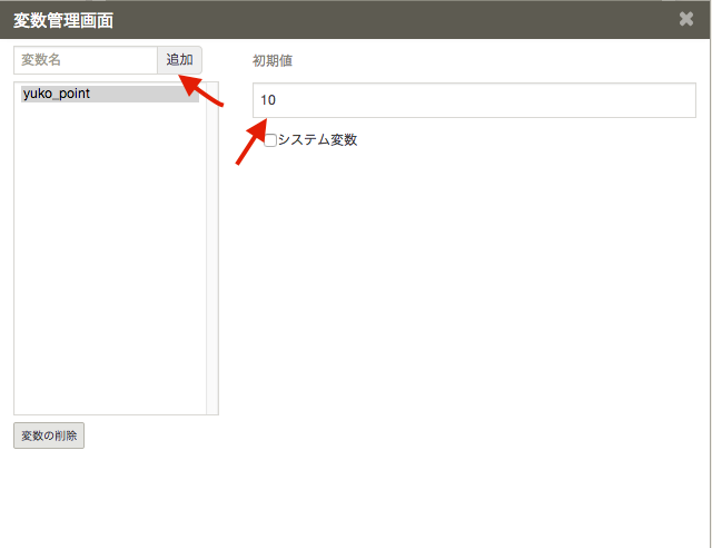 変数名に「yuko_point」と入力後、「追加」ボタンを押します。